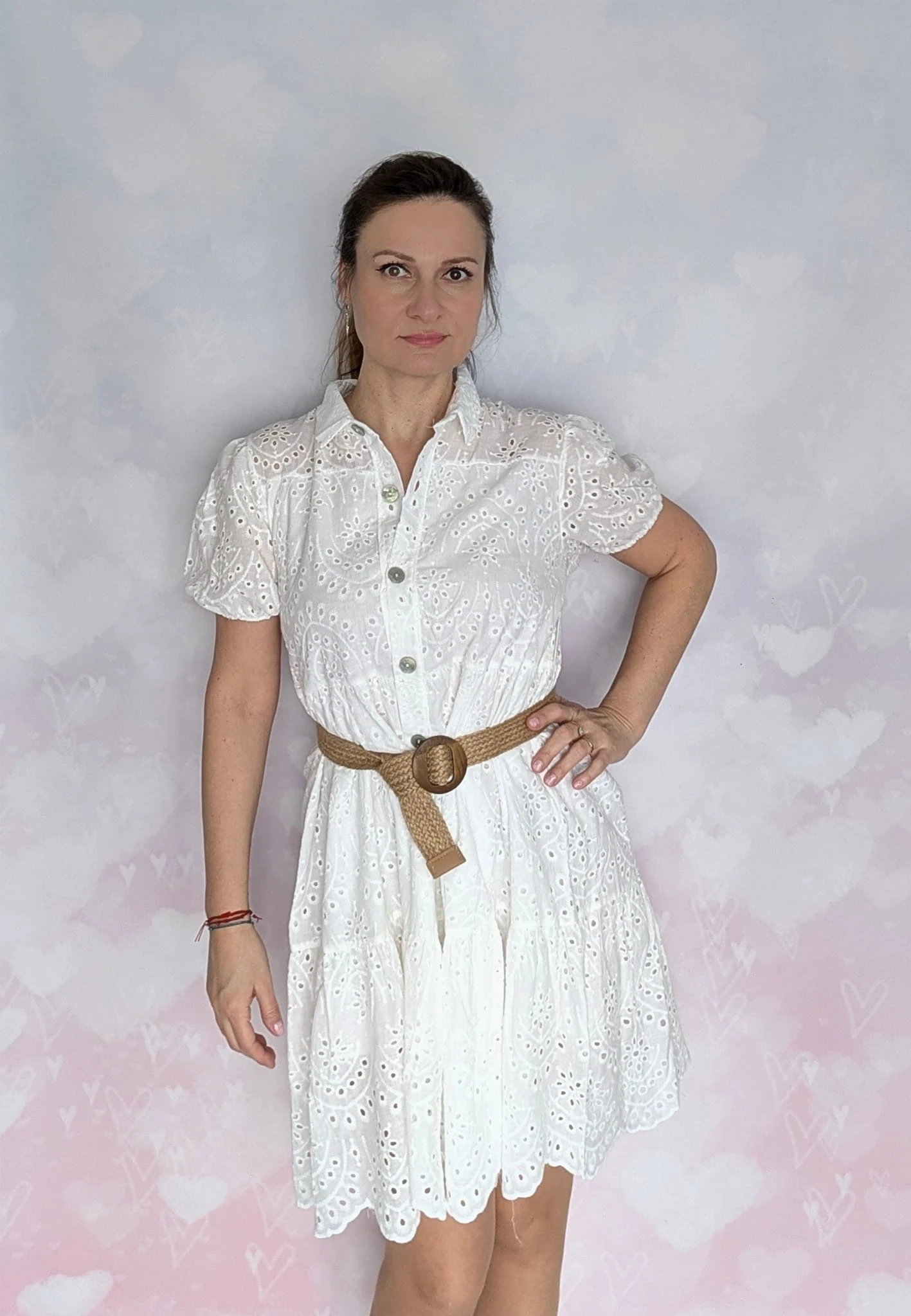 Biała sukienka bawełniana w 100% z haftem angielskim i paskiem