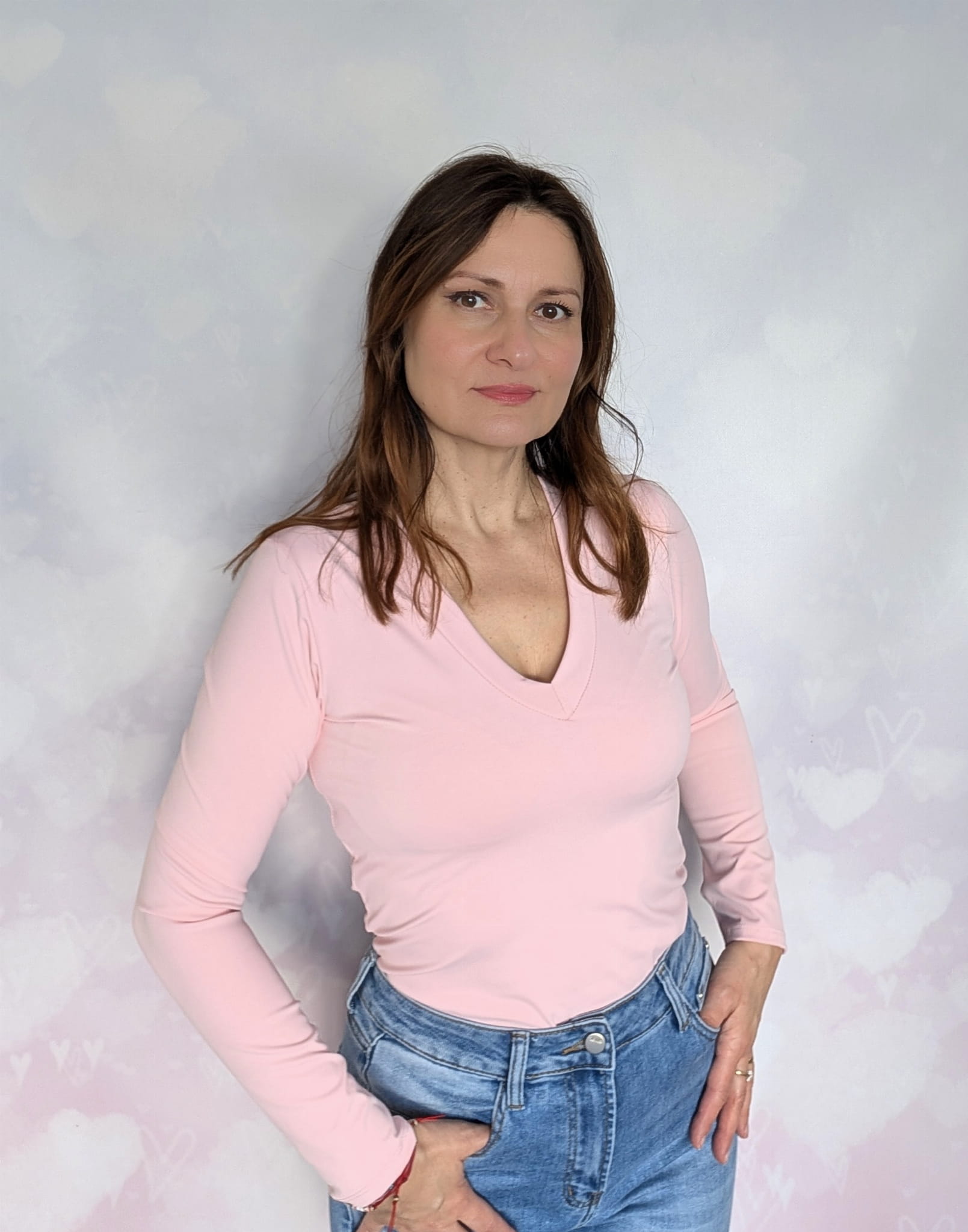 Elegancka bluzka z dekoltem V, pastelowa kolekcja- różowa