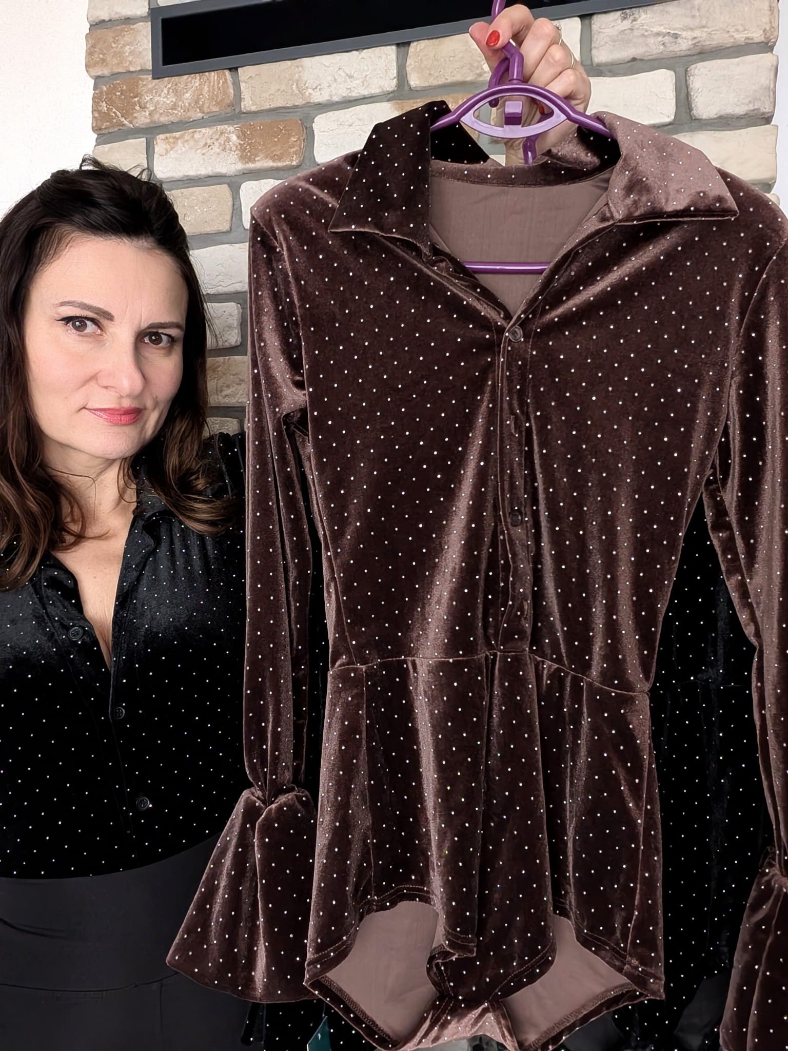 Eleganckie welurowe body z długim rękawem i ozdobnymi kryształkami brązowe