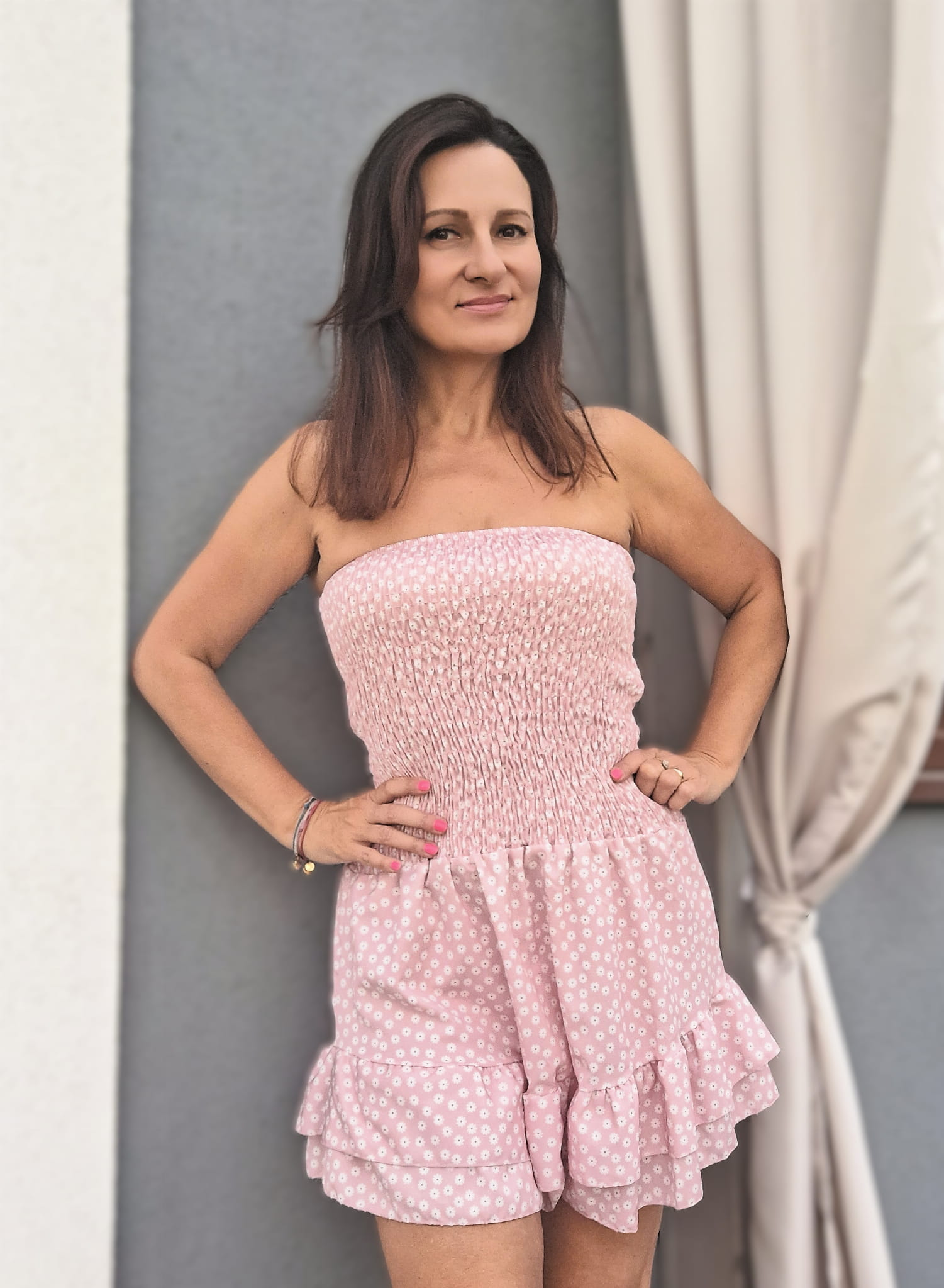 Uroczy kombinezon z marszczeniem, idealnie dopasowuje się do sylwetki, w drobny kwiatowy wzór, spodenki wykończone falbankami. Bardzo wygodny w noszeniu i zakładaniu. Kombinezon w 50% ma w składzie wiskozę, nie wymaga prasowania. Produkt włoski. Rozmiar uniwersalny.