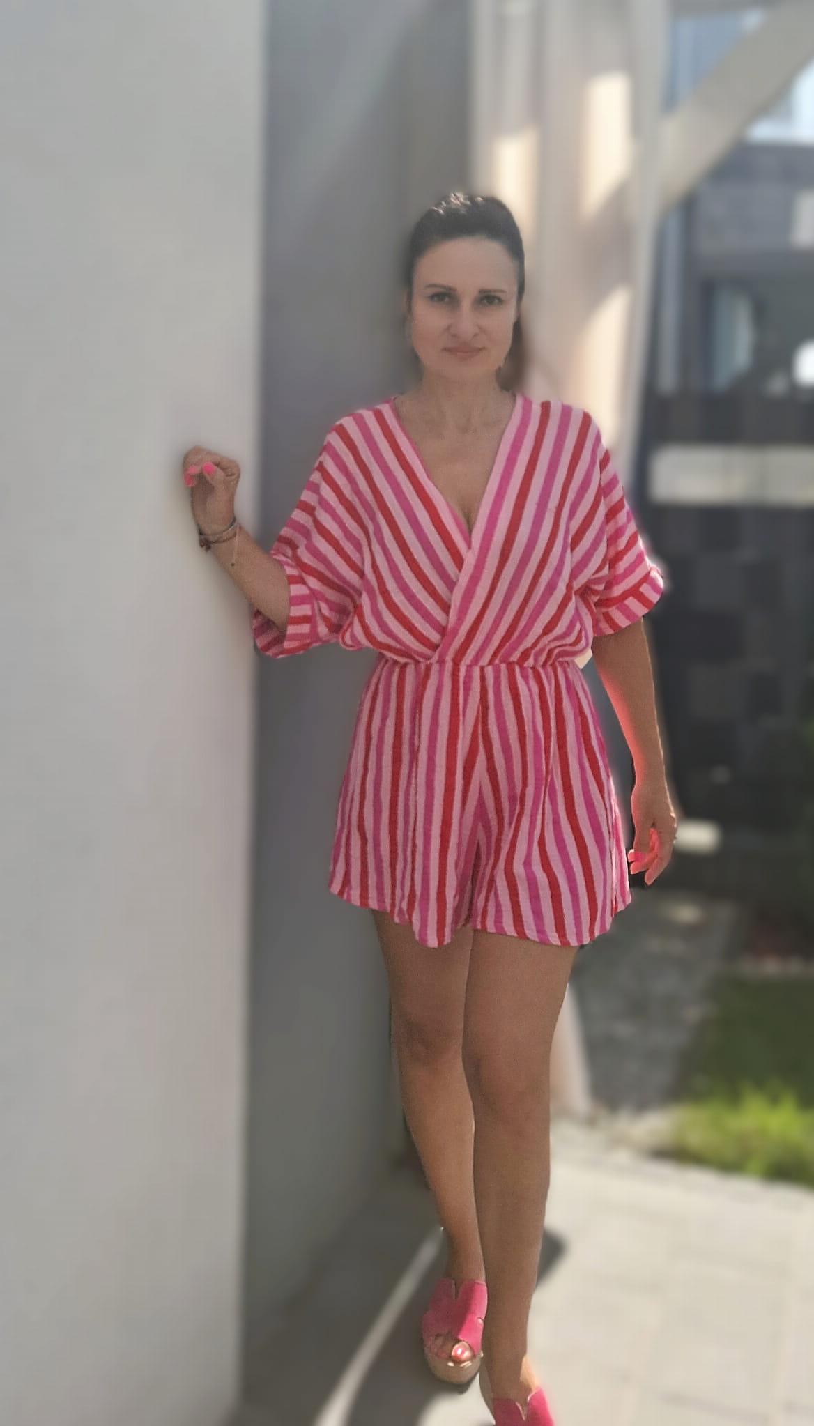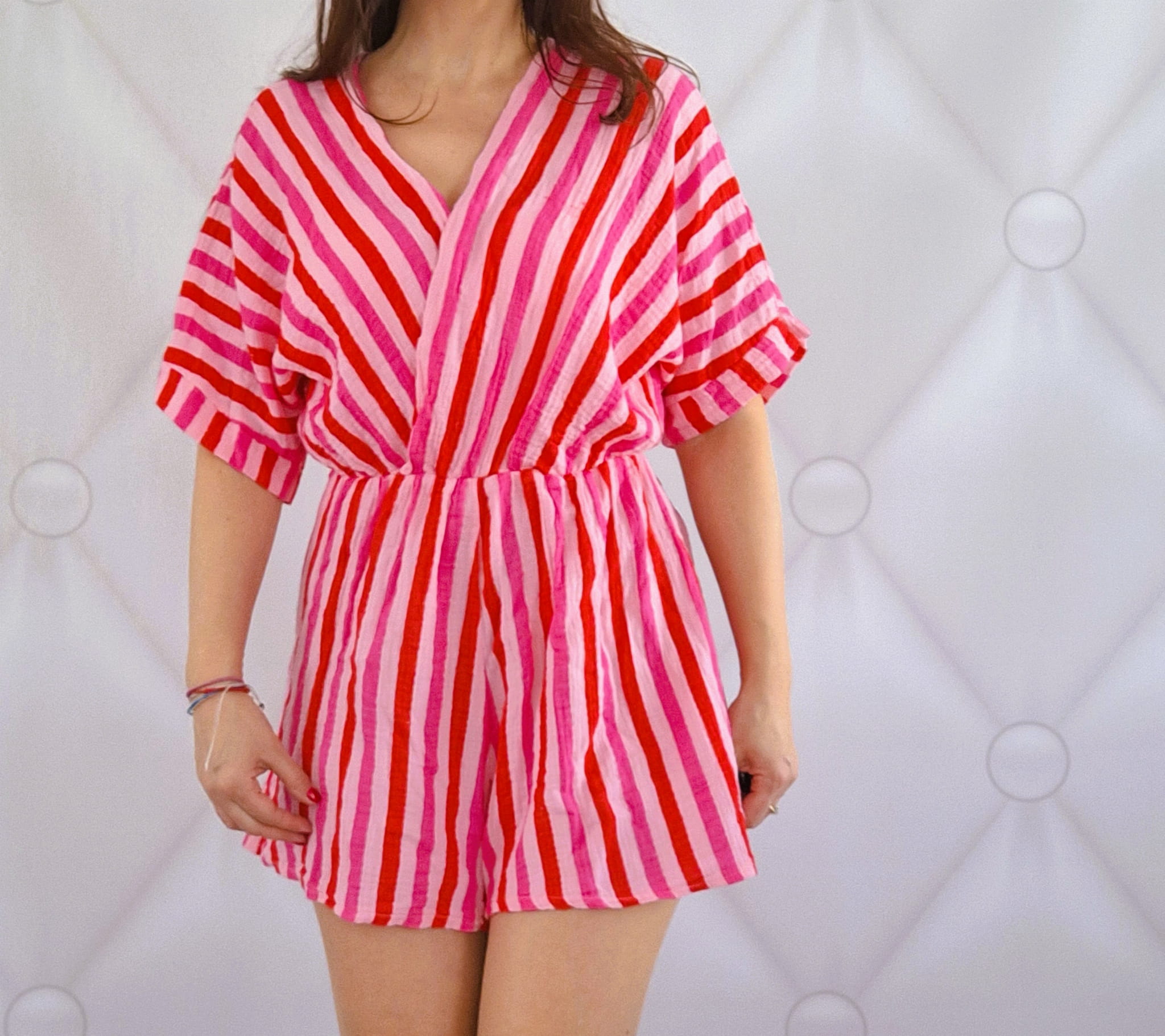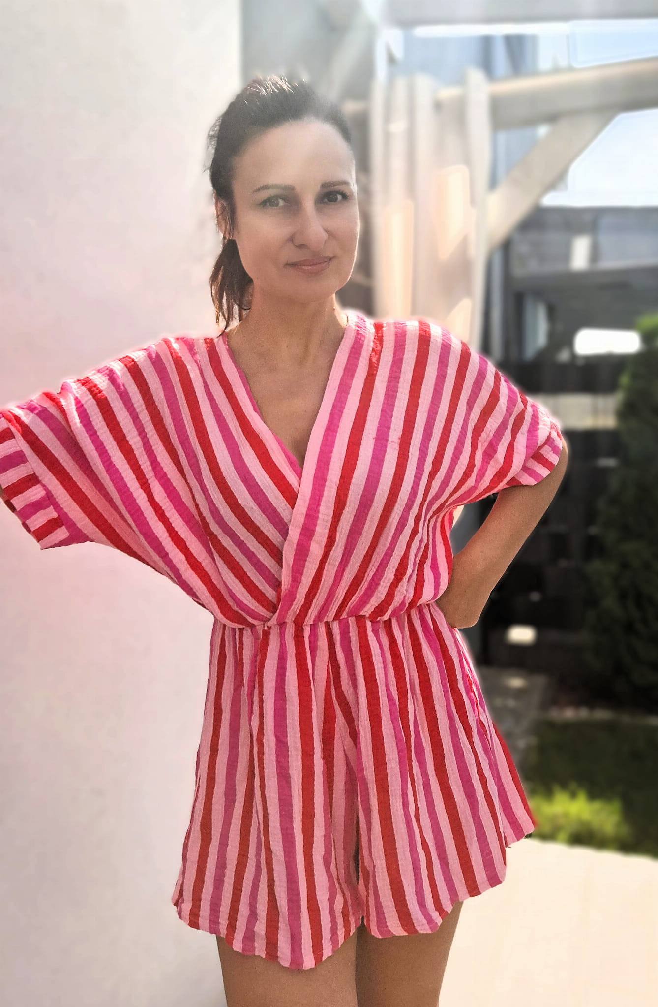 Kombinezon muślinowy w paski, czerwono, różowo fuksjowy