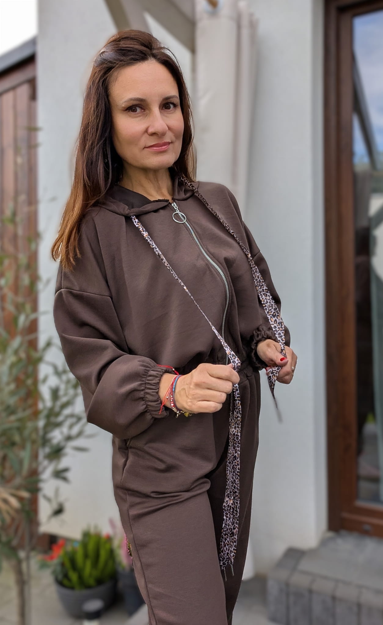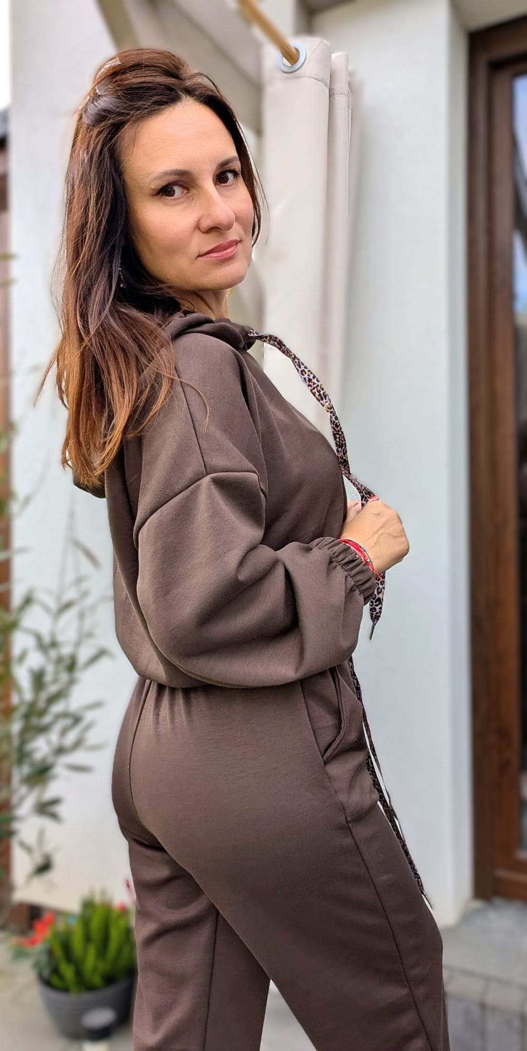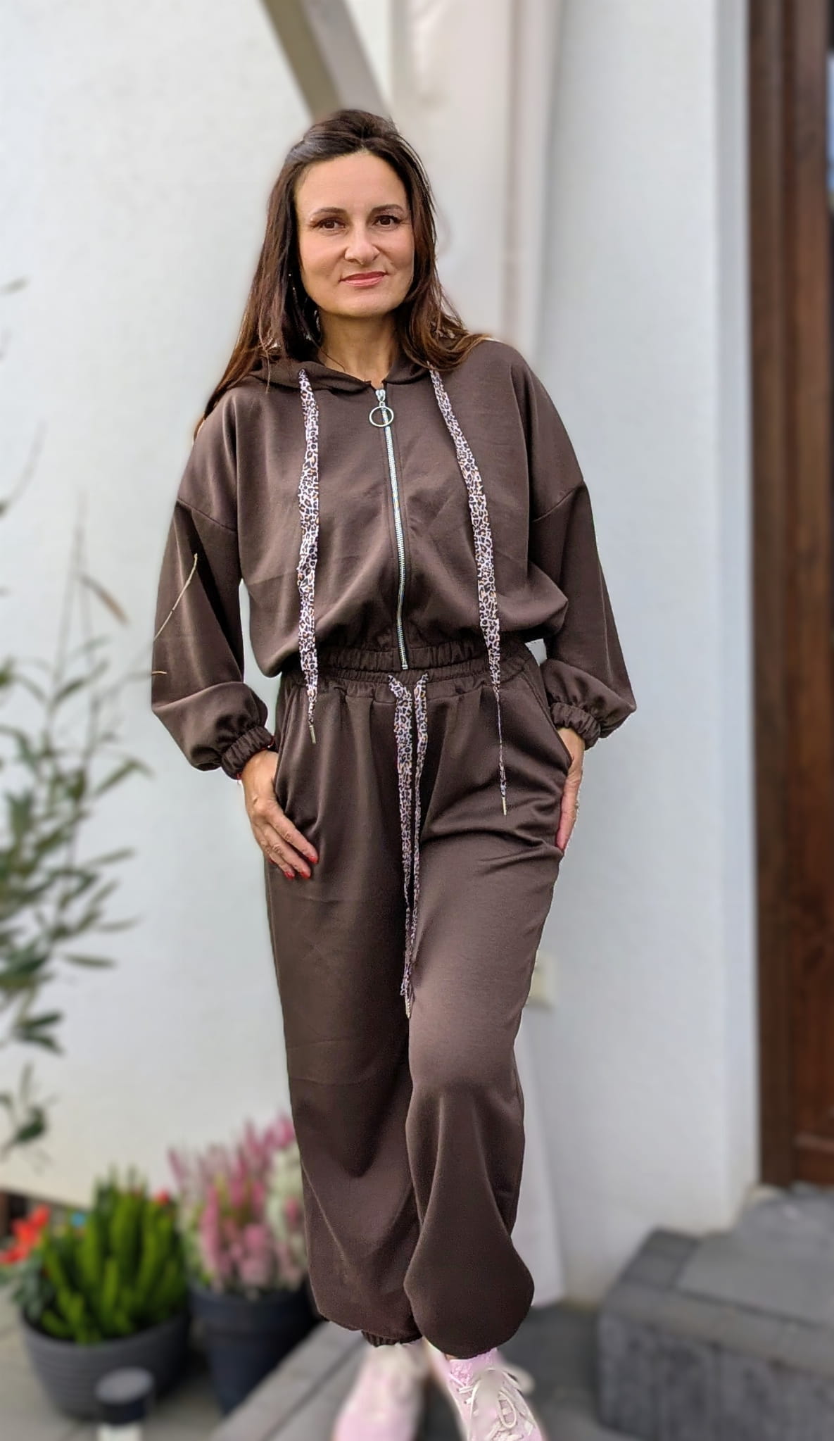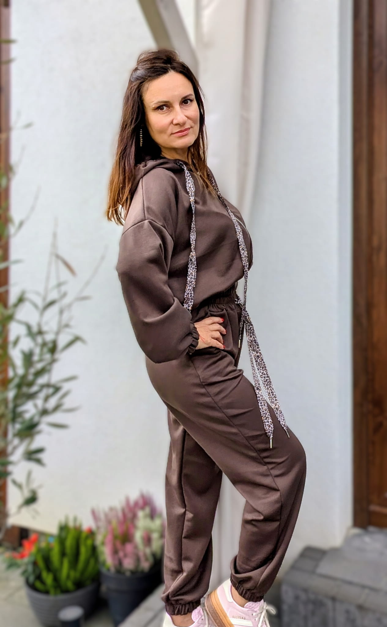 Wygodny, niesamowicie skrojony komplet dresowy, który nie wygląda jak klasyczny dres. Idealnie skrojone spodnie zakończone gumką oraz bluza z kapturem nie za długa z ozdobnymi troczkami idealnie dopełnia całość. Produkt włoski. W składzie 95% stanowi wiskoza.