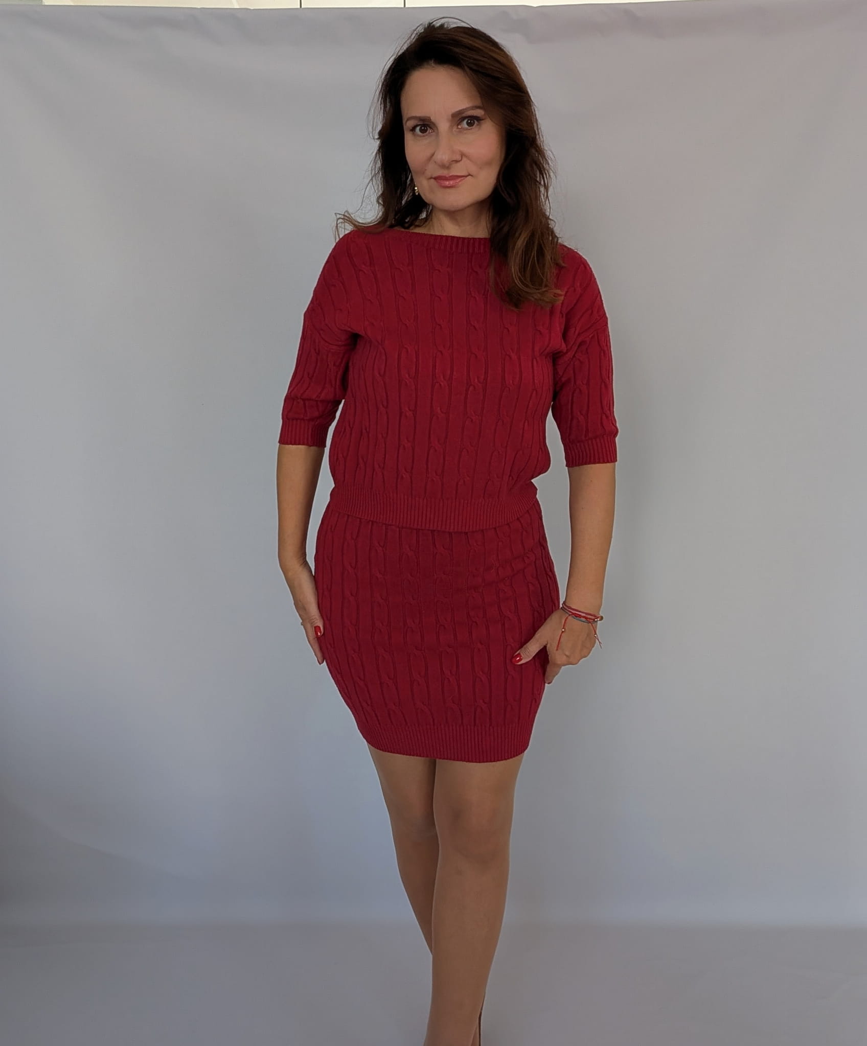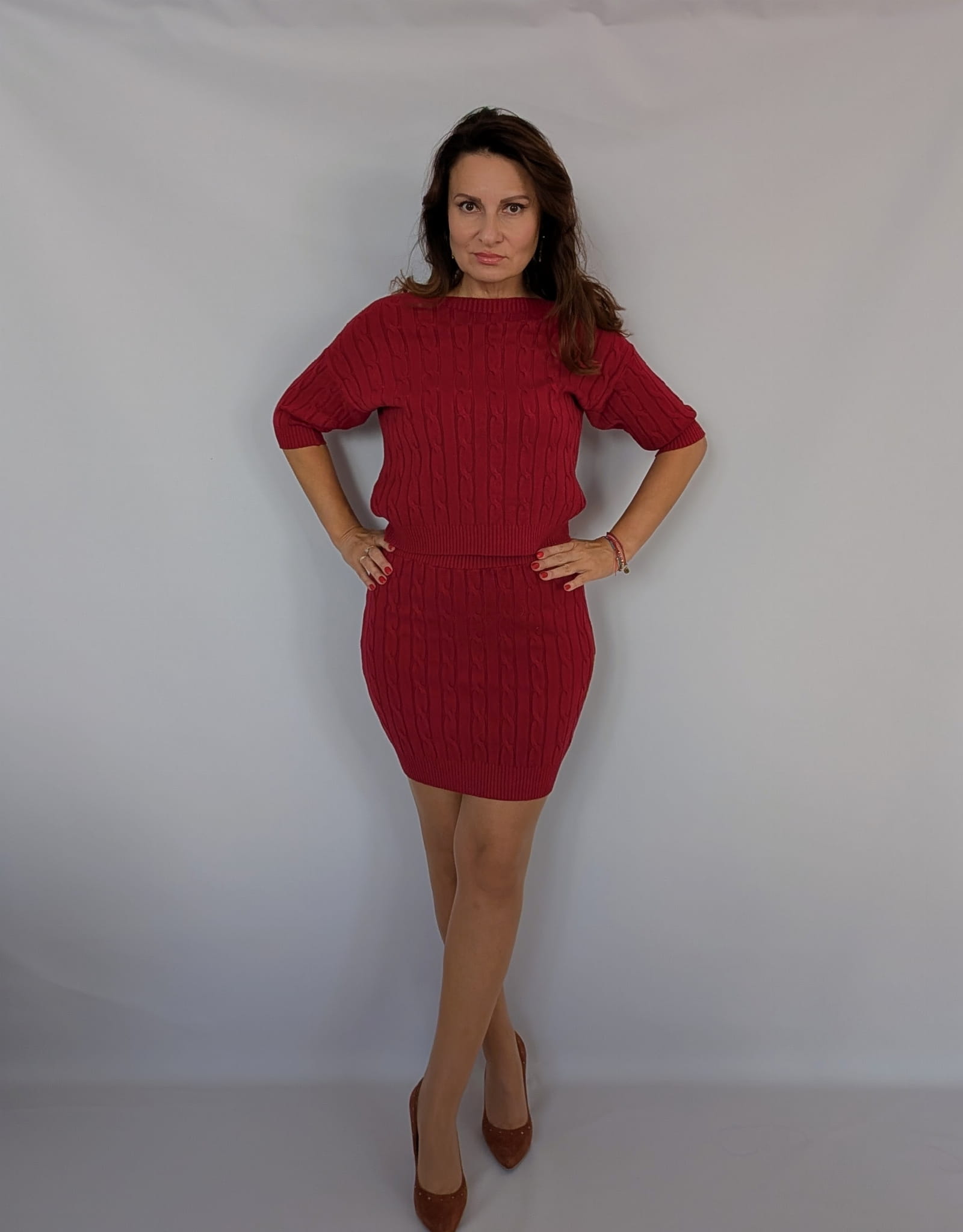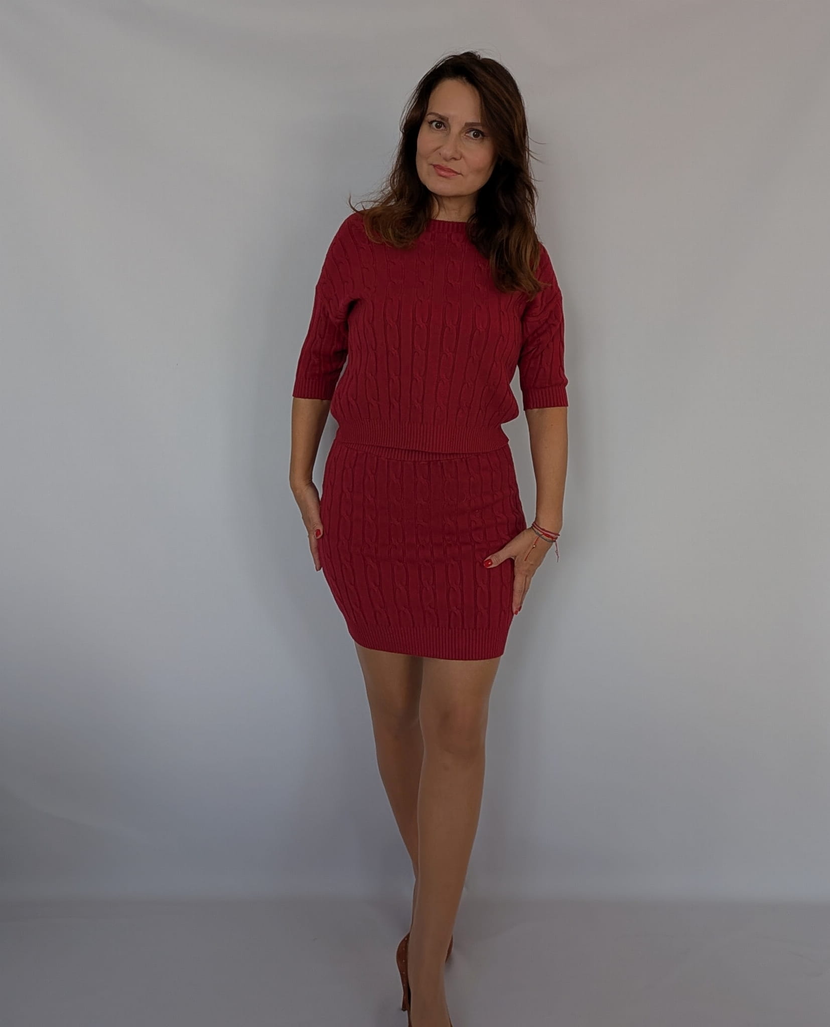 Komplet dzianinowy ze spódnicą i sweterkiem, ciemno czerwony/burgund