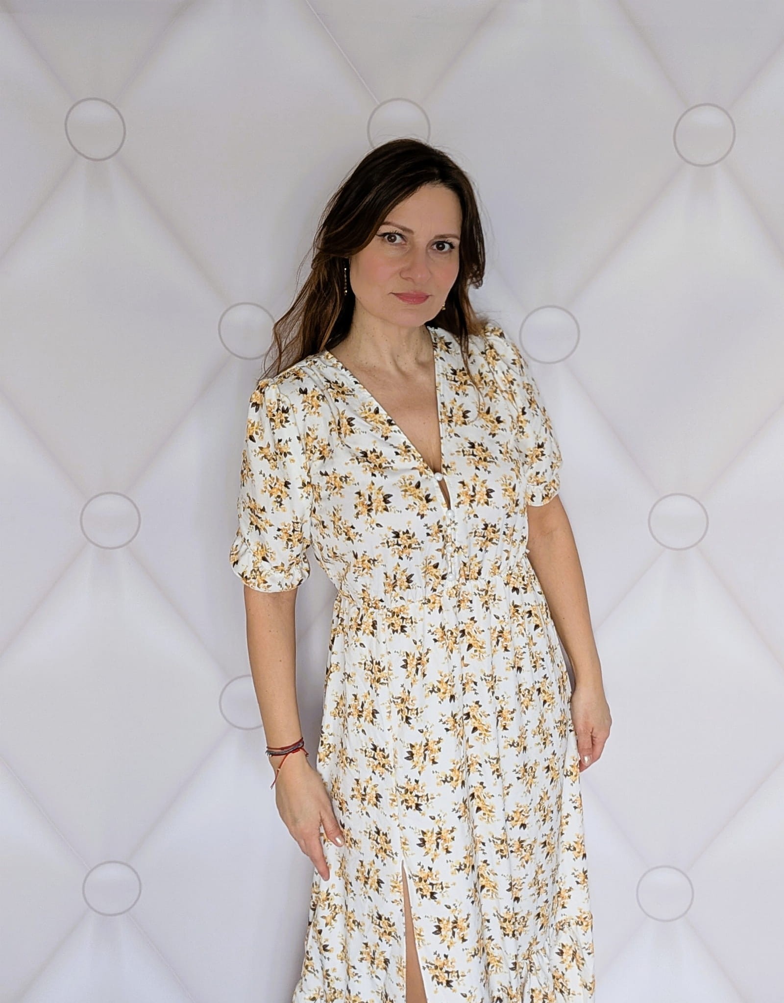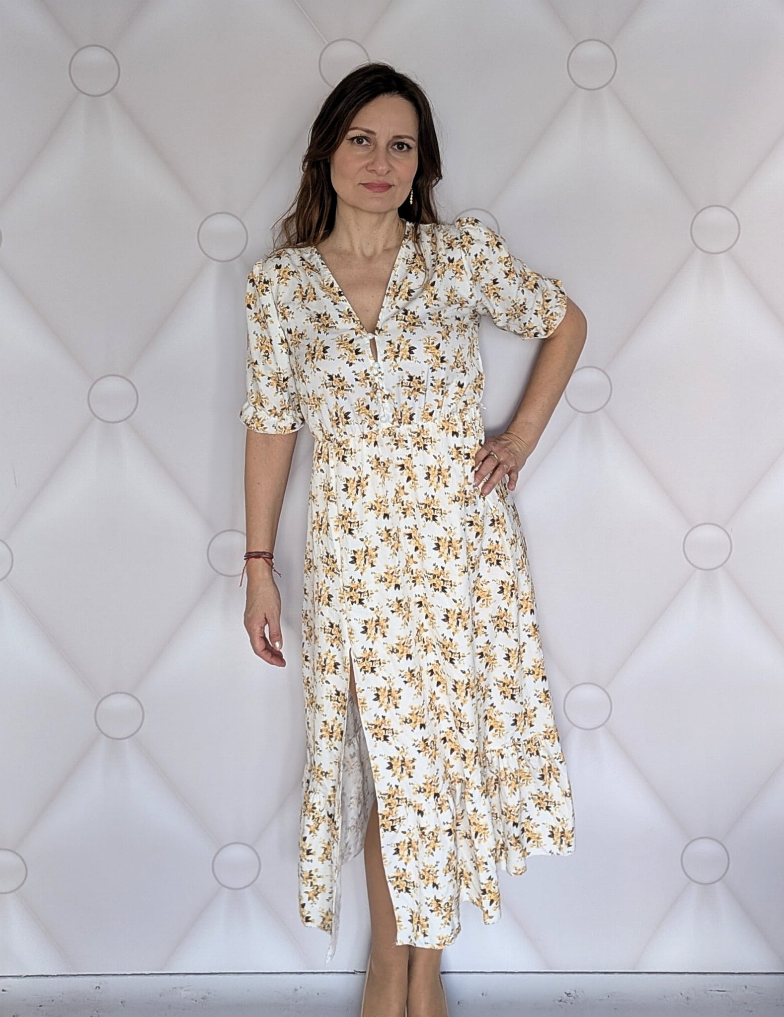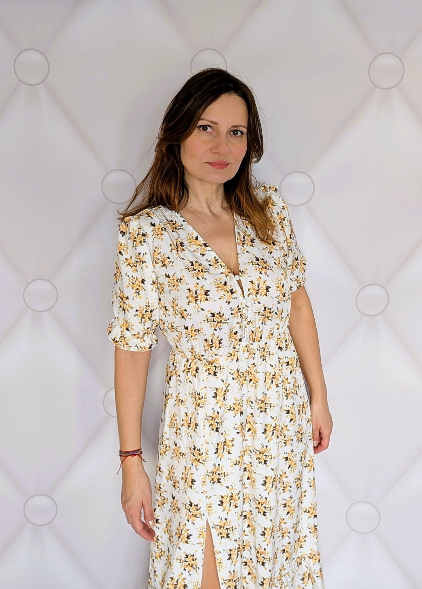 Kwiecista sukienka maxi z rozcięciem-elegancja i komfort biało - żółta